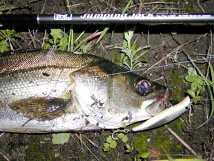 バンザイ! 2001年9月24日 川崎市の宮澤さん、9/24 2:00am頃 カルマ130カタナで81cmをゲット! <本人のコメント> 念願のバンザイがBANZAIできました。 ありがとうございました。 |
