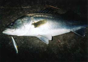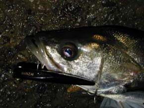 #66 2001年1月18日 今年初の多摩川。 「ここ!」と思ったところにルアーが 入ったその時、シープ115が吸い込まれた。 引きが変なのでマルタかと思ったが、 上げてみたら64cmのホシスズキだった。 その後、もっと良い魚をバラし、 時合い突入かと思いきや、友人から 2連発の電話で時合いを逃す…(涙)。 釣り中は電話には出ない方が良いみたい。 by あくた シープ115エボニー |