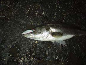 #68 2002年2月18日 千葉の吉田さん カルマ130 にじ でゲット <本人のコメント> ルアーが波を引きながら泳いでくると ジュボって吸い込まれる。 やっぱりバイトの瞬間が目視 できるっていうのは最高です。 |