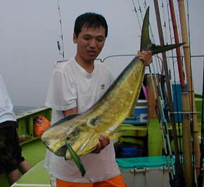 2002年7月13日 今シーズン初の相模湾のシイラ。 このときのために前々から用意していた 勝負ルアーのスロージャークで誘いをかける。 この雄シイラ、視界の外から一直線に 飛んできて、何の迷いもなくバイト。 その後、ラインは水しぶきを上げて 走りまくり…、それに合わせて僕も 船をひとまわり(笑)。 叉長で104cm、相模湾としては まずまずのナイスサイズだった。 by あくた モンロー140プロト |