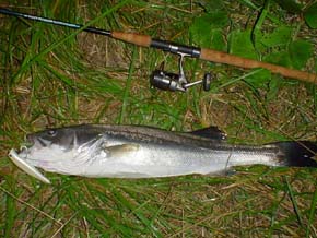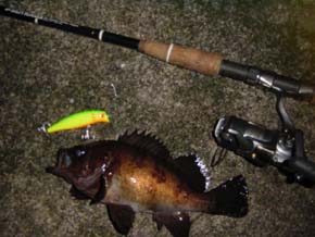 2002年4月4日 大田区の辻さん カルマ130のカタナでゲット <本人のコメント> メバルの猛攻をかわしながら ゲットしたのは65cmほどのシーバス。 カルマに騙されて怒っているようですね。 |