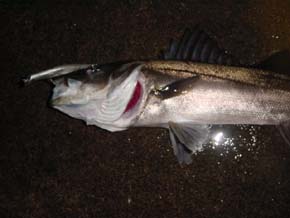 2002年4月4日 この写真も上の辻さんのから。 猛攻を交わしきれないと このような結果を招くようです(笑)。 シーバス以外の釣果も募集中。 みなさん、写真待ってます! by あくた |