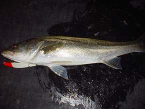 2002年11月4日 大田区の加藤さん ウルフ115でゲット! <本人のコメント> ウルフでの初釣果です。 軽くジャークを入れてストップを 入れた瞬間にガツンときました! |