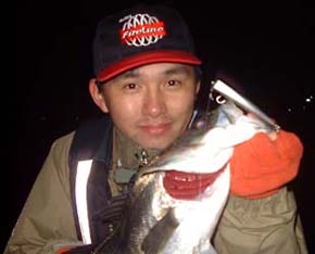 #23 2001年2月24日 56cm 横浜の上田さん シープ90 カタナでゲット! <本人のコメント> 雨と風の中…。 寒さにめげて諦めかけていた頃、 シープが魚を連れてきてくれました。 |