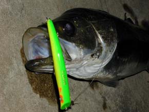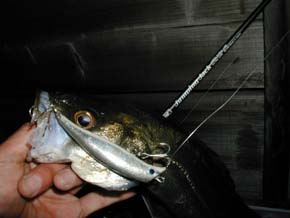 #40 2001年5月9日 横浜の小迫さん ナイスコンディションの76cmをゲット! <本人のコメント> 派手なボイルに遭遇したのでいろんな ルアーを通してみましたが反応がない。 これでだめなら帰る!と、カルマ9cm 重心移動チャートバックにチェンジし、 ロッドを立て気味で、表層を意識して 引いてきたら一投目で水柱がたちました。 76cm、ルアーは丸呑みでしたが、 バーブレスにしておいてよかったです。 元気に帰っていってくれました。 |