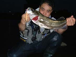 #45 2001年7月17日 新潟の秀さん カルマ100でゲット! <本人のコメント> 河口のワンドのシャローにて カルマ100デッドスロー この日は深夜から夜明けまで 3バイト2フィッシュ(40チョット) |