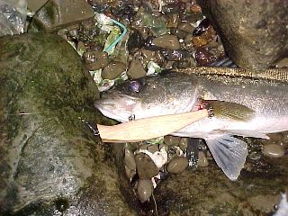 1月7日 10:00pm〜3:30am 港湾部 56センチ/ランディング数1 BANZAIリップレス90(重心移動) ディスカッションの日。 フリークの仲間4名と釣行。 全員釣ったが、まだ魚の コンディションは良くない。 |