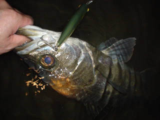7月24日 ウルフ100 RH・ホイル リリースの目処が立ったから エスケープ!Wild Wild West(笑) 港湾のフッコをいっぱい釣った このルアーは試しに一番重い素材で作ったもの。速度領域が狭すぎて売り物にはなりません。 でも楽しい奴でした。 |