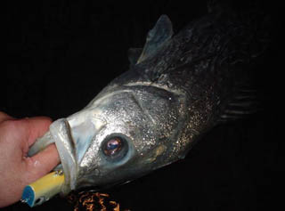 6月19日 10センチの爆弾 必死になって夕方出る。 一週間ぶりの釣行だ。 アクロ、ウルフ115でショートバイト。 ウルフ90でフッコクラスが釣れだし、 夕闇迫る時間帯にこいつの水面直下ハードトゥイッチが炸裂。 全てのバイトがピンポイントだったことから、解けなかったパズルがカチッとはまった感じだ。 |