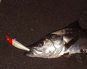 #61 2001年12月2日 二日前にデカイのを獲った ポイントへ再度向かう。 今日こそはBANZAIで 釣らないと気が済まない! 魚がつきそうなブレイクに 沿ってカルマ100を通す。 よろめかせたカルマを そのまま流し始めたとき 思い通りにヒット。 ナイスファイトで上がったのは グッドコンディションの 70弱だった。 by あくた カルマ100RH |