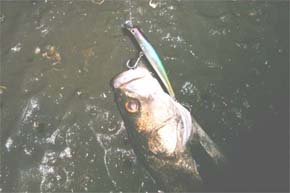 #66 2001年1月18日 今年初の多摩川。 「ここ!」と思ったところにルアーが 入ったその時、シープ115が吸い込まれた。 引きが変なのでマルタかと思ったが、 上げてみたら64cmのホシスズキだった。 その後、もっと良い魚をバラし、 時合い突入かと思いきや、友人から 2連発の電話で時合いを逃す…(涙)。 釣り中は電話には出ない方が良いみたい。 by あくた シープ115エボニー |