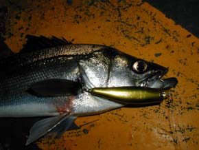 2002年4月4日 大田区の辻さん カルマ130のカタナでゲット <本人のコメント> メバルの猛攻をかわしながら ゲットしたのは65cmほどのシーバス。 カルマに騙されて怒っているようですね。 |
