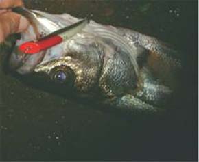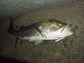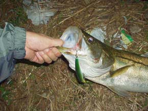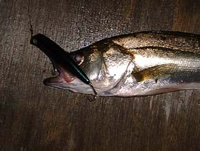 2002年9月26日 千葉の吉田さん カルマ100のクリアRHでゲット <本人のコメント> 着水してトゥイッチを2回してすぐ、 ガツンと来ました。 この日はただ引きよりルアーを 動かした方が良かったです。 |