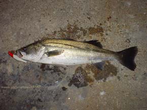 2002年9月27日 大田区の藤森さん カルマ&シープで本領発揮 <本人のコメント> カルマ100オレンジで3本(55〜60)。 カルマ90カタナにチェンジで又長75p。 その後シープ90WMでも獲りました。 魚は水深50pの足元にいた。 |