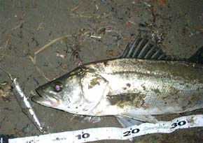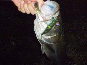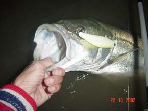 2002年11月4日 大田区の加藤さん ウルフ115でゲット! <本人のコメント> ウルフでの初釣果です。 軽くジャークを入れてストップを 入れた瞬間にガツンときました! |