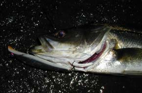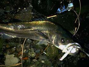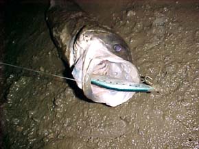 #23 2001年2月24日 56cm 横浜の上田さん シープ90 カタナでゲット! <本人のコメント> 雨と風の中…。 寒さにめげて諦めかけていた頃、 シープが魚を連れてきてくれました。 |