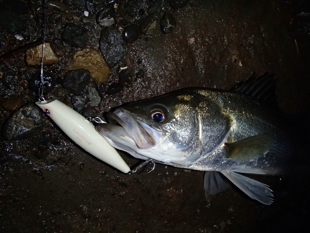 夏場、トップウォーターが好調だった場所を覗きに行くと珍しくベイトが居るので試しにポップンを投げたら直ぐに釣れてしまいました。