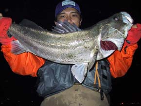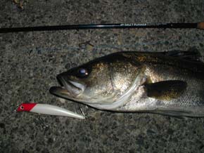 #40 2001年5月9日 横浜の小迫さん ナイスコンディションの76cmをゲット! <本人のコメント> 派手なボイルに遭遇したのでいろんな ルアーを通してみましたが反応がない。 これでだめなら帰る!と、カルマ9cm 重心移動チャートバックにチェンジし、 ロッドを立て気味で、表層を意識して 引いてきたら一投目で水柱がたちました。 76cm、ルアーは丸呑みでしたが、 バーブレスにしておいてよかったです。 元気に帰っていってくれました。 |