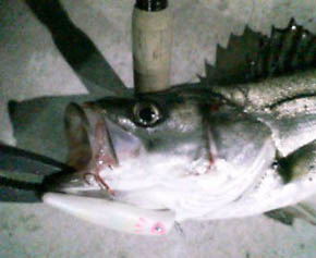 #405 2005年5月29日 北区 ハンドルネームHさん ポテグリJr 5cm程度のベイト(イナッコ)が追い立てられ沸き立つ場所を掠めるようにトゥイッチしながら通すと即バイト。 昨日は同じルアーの波紋引きで水面を割らせました。 ランディングに躊躇して逃げられましたが… けっこう芸達者でしょ? [from sasaki] |