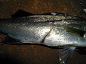 #41 2001年5月21日 「あらら、喰っちゃった…」。 これが正直な感想だった。 ルアーを派手にチェイスし、 果敢にバイトした30半ばだった。 困ったもんだと思いつつ 魚体を見て驚いた。 治りかけてはいたものの凄い傷だ。 反対側の面にも同じくらいの深い切り傷。 どうしてこんなに傷ついたのか…。 改めてシーバスの生命力に驚いた。 どんな時も諦め半分で蘇生してはいけない。 本来、こんなに強い力を備えているのだから。 そう再認識させてくれた印象深い1尾だった。 by あくた |